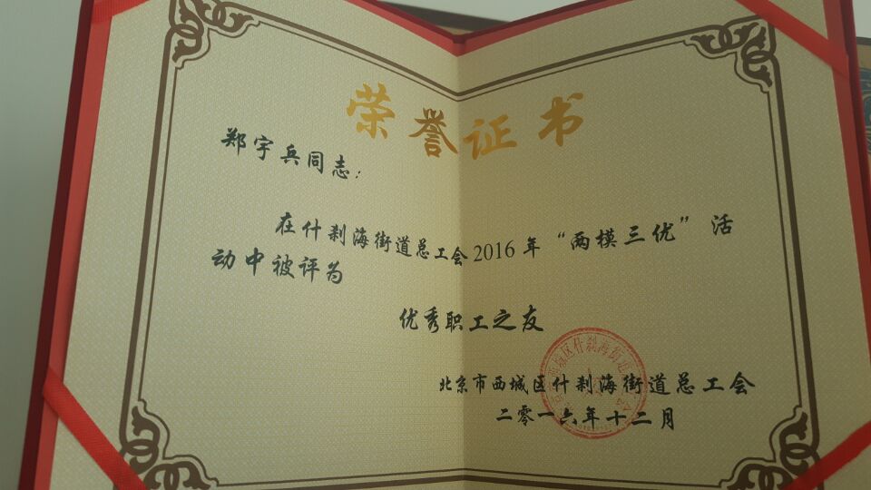 北京大陸航星質(zhì)量認(rèn)證中心股份有限公司總經(jīng)理鄭宇兵在什剎海街道總工會2016年“兩模三優(yōu)”活動(dòng)中被評為優(yōu)秀職工之友。